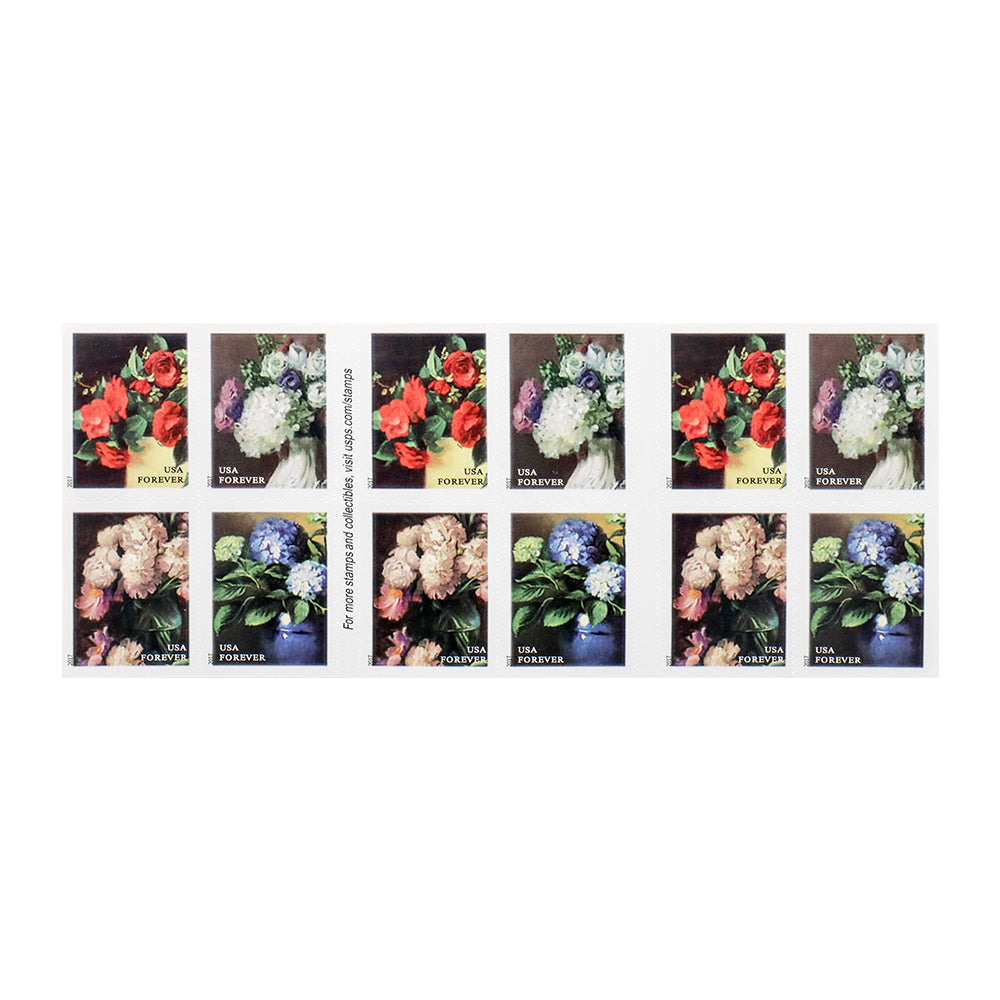 The 20-stamp sheet features four images inspired by 17th and 18th century still-life paintings of garden flowers: red camellias and yellow forsythia in a pitcher; white peonies and pink tree peonies in a vase; white hydrangeas, white and pink roses, green hypericum berries and purple lisianthus in a vase; and blue hydrangeas in a pot.